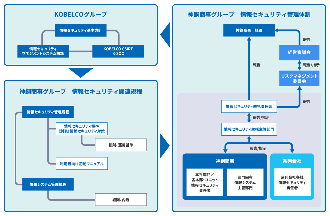 KOBELCOグループ「情報セキュリティ基本方針」に基づき、当社および系列会社(以下、当社グループ)において、適切な情報セキュリティ対策に取り組むための体制や役割、運営に関する基本的な考え方を「情報セキュリティ管理規程」および「情報セキュリティ標準」に定めています。