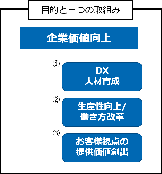 DX推進の目的を「企業価値向上」と定め、「DX人材育成」、「生産性向上/働き方改革」、「お客様視点の提供価値創出」の三つのアプローチを同時並行で推進して参ります。