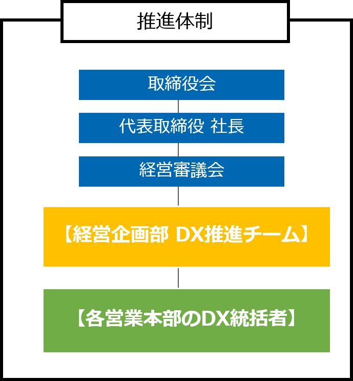 経営企画部 DX推進チームの統括・主導のもと、各営業本部においてもDX統括者を選任し、全セグメント横断体制で推進して参ります。また、DXは今後も当社の持続的な成長に不可欠な取組みであることから、DX推進チームが取組みや進捗を直接経営審議会に報告する体制にて、DXを推進いたします。