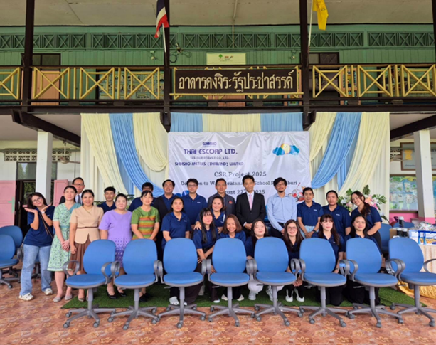 当社タイ現地法人のタイエスコープと、神商メタルズタイランドは共同で2025年8月18日にタイ中部ラーチャブリー県の小学校に、什器買い替えで不要となった椅子 79脚に加え、サッカーボールなどスポーツ用品を寄贈しました。